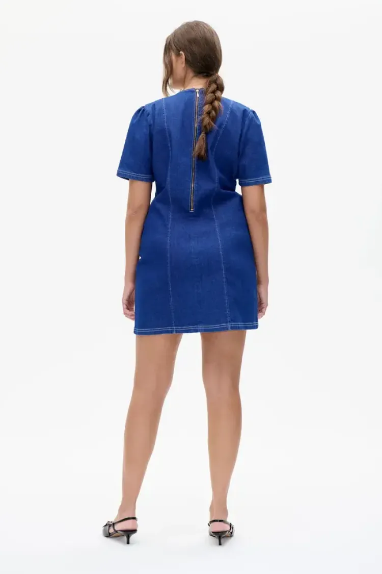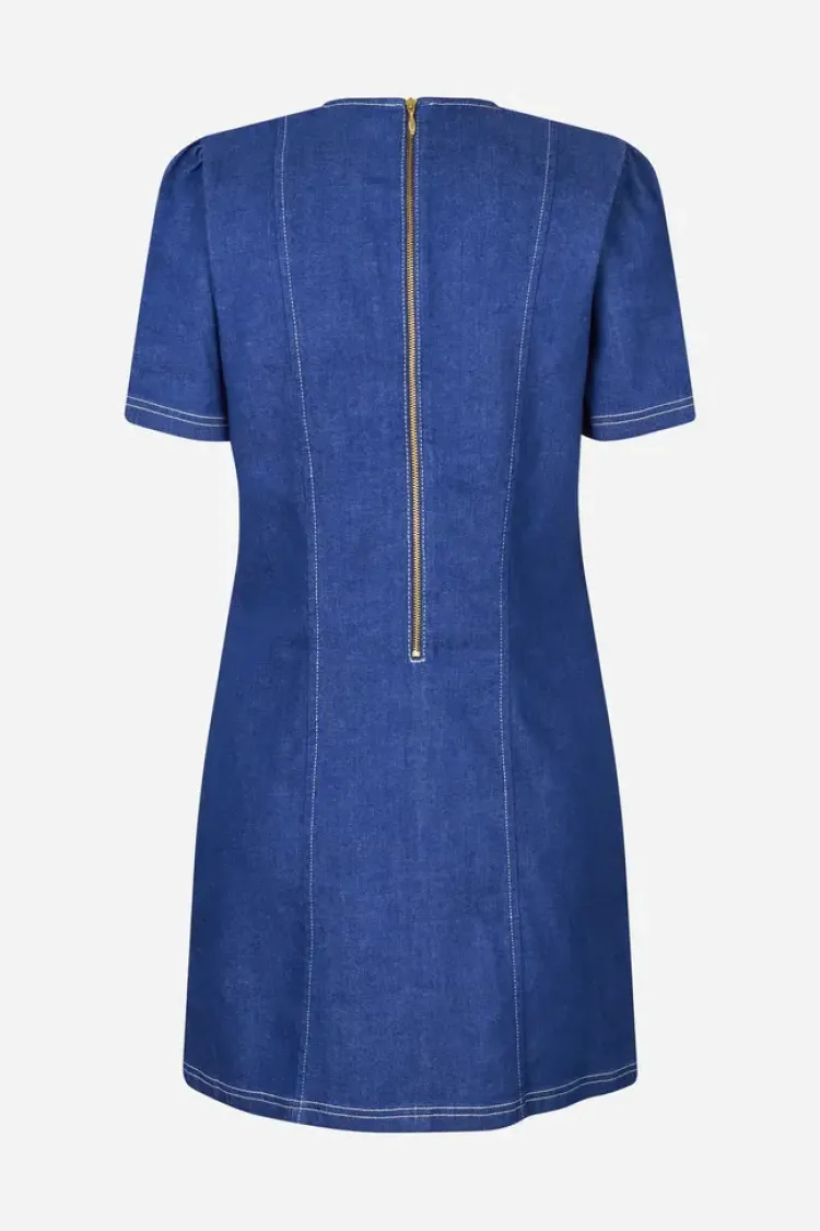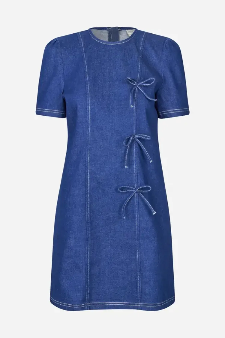 De Amali jurk is een stretchy denim minijurk met een A-lijn silhouet, korte gepofte mouwen en een strik vooraan, met een ritssluiting op de rug, ideaal voor allerlei gelegenheden.
