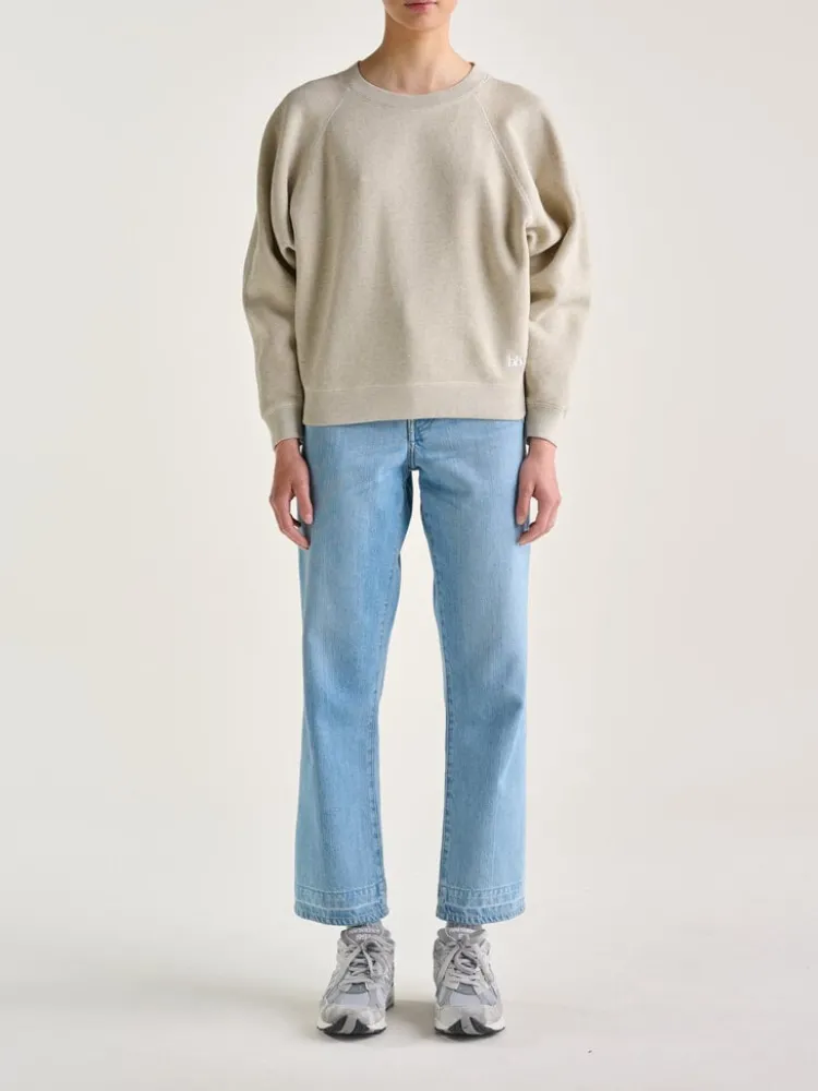 De Fella is een relaxte sweater met een ronde hals, boorden om de pols en onder aan de trui.