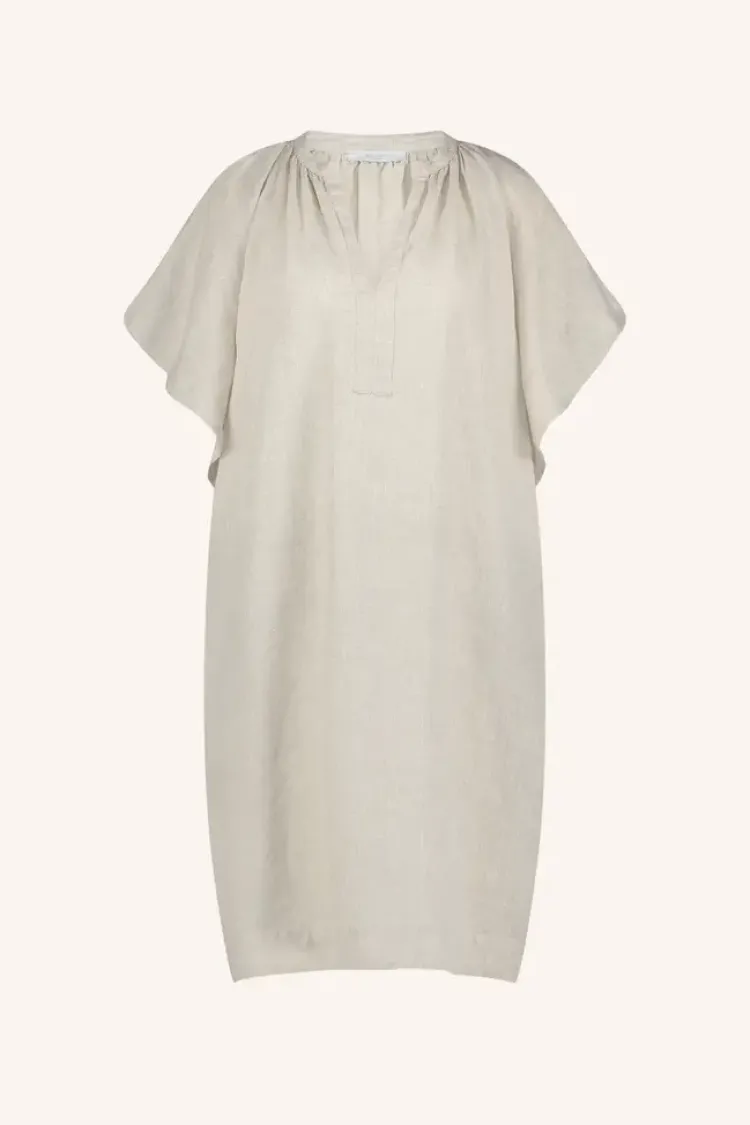 De Vina Dress is een knielange, casual jurk met een losse pasvorm, ideaal voor warme dagen. De jurk heeft een V-hals en korte mouwen en is gemaakt van linnen materiaal, wat zorgt voor luchtig comfort.