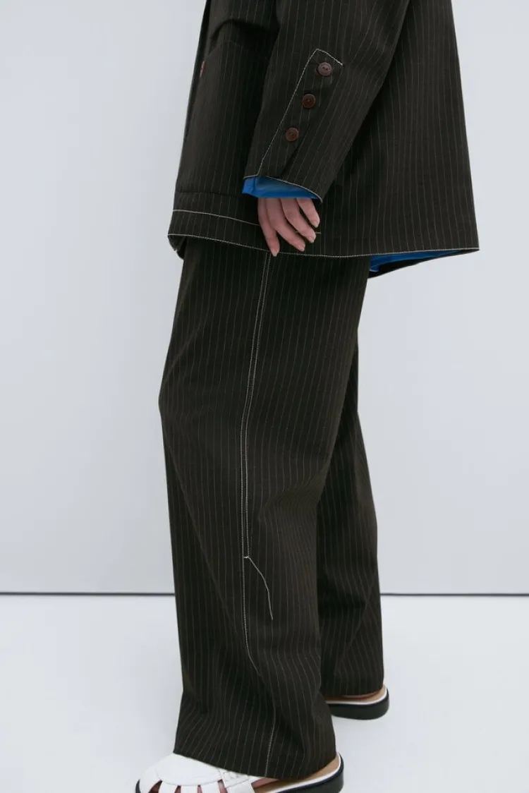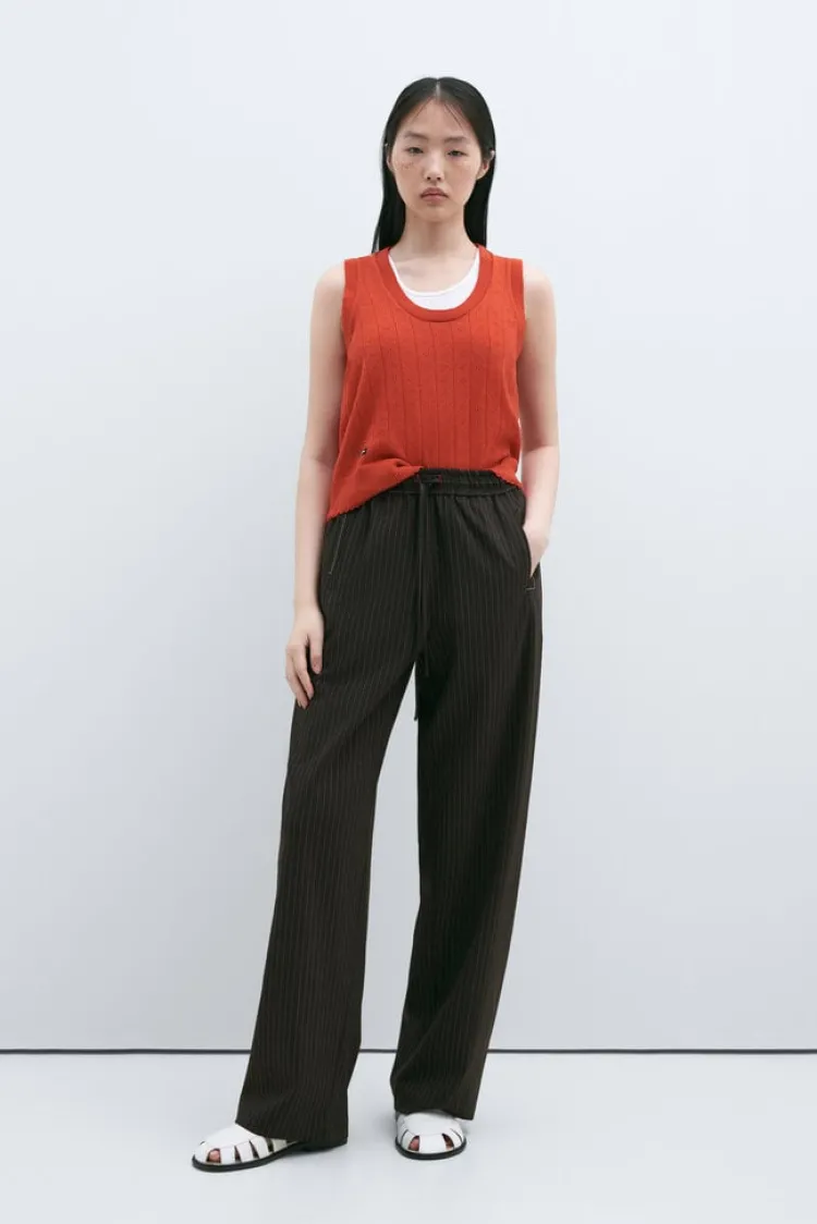 Relaxte en comfortabele broek met een losse pasvorm. De broek heeft rechte pijpen, contrasterende stiksels, een trekkoord met rood stiksel, zijzakken en een nepzak. De stof heeft een streeppatroon.