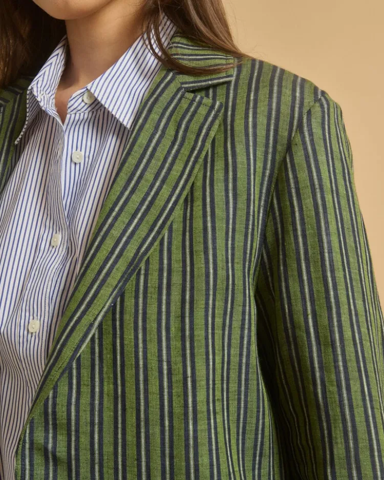 Het Vouzieto Jacket is een stijlvolle blazer van 100% linnen, uitgevoerd in een opvallend groen gestreept patroon. Deze blazer heeft een klassieke pasvorm met een enkele knoopsluiting aan de voorkant.