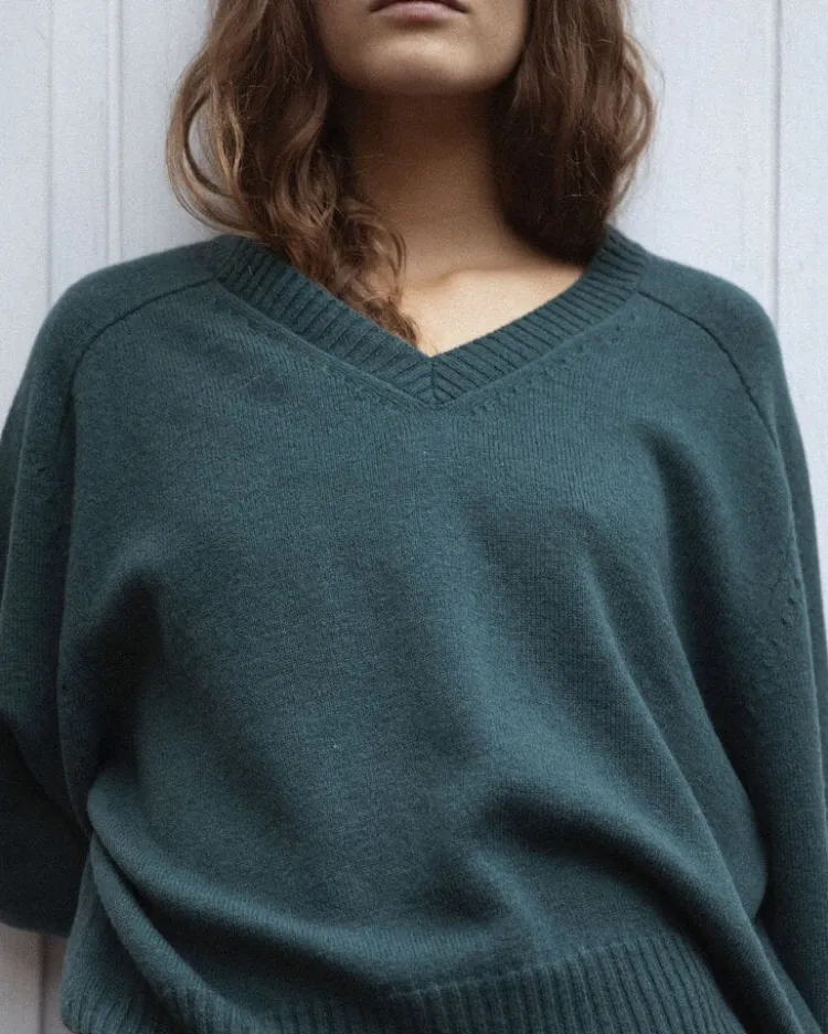 De Cassis is een mooie V-hals sweater met een oversized pasvorm. De sweater heeft een ribboord langs de hals en splitten aan de zijkanten van de manchetten. Deze is geproduceerd door een klein familiebedrijf in Italië, wat topkwaliteit garandeert.