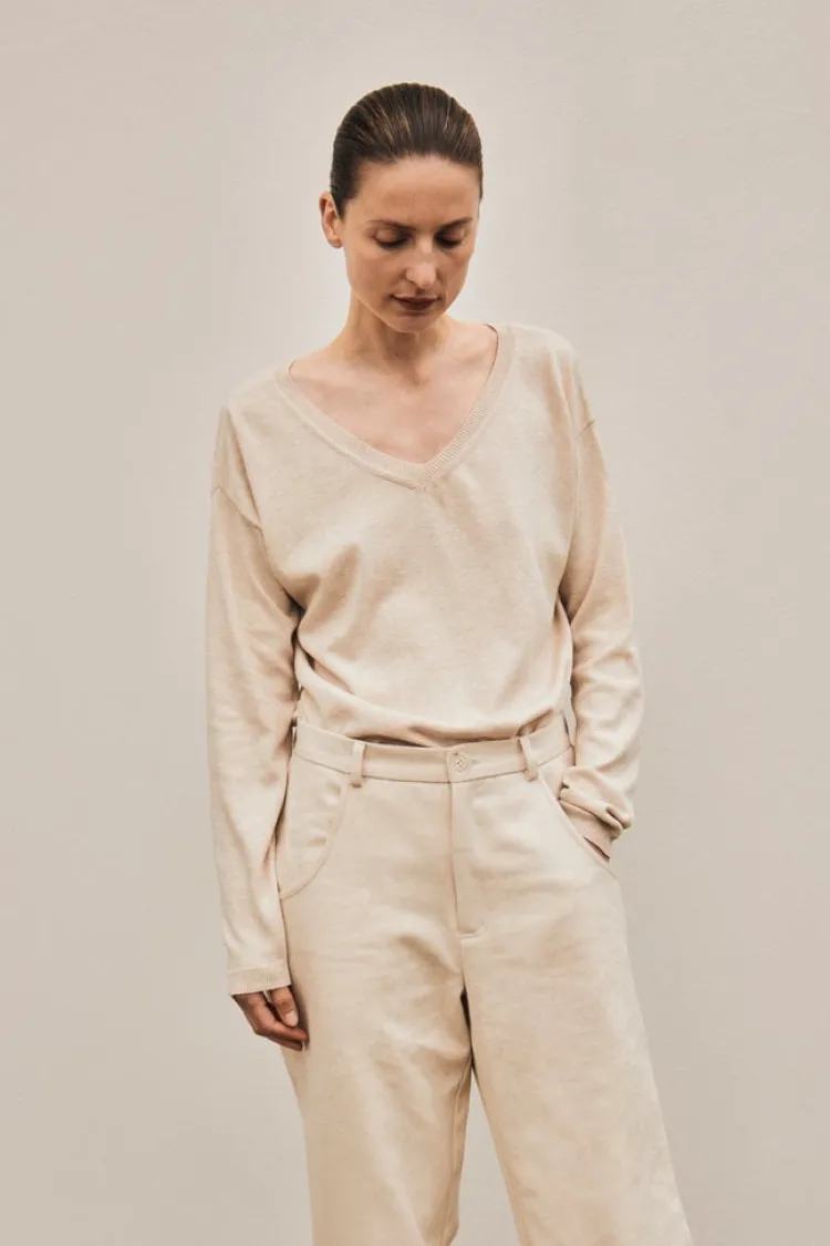 De Rousseau is gemaakt van 100% Katoen. De Rousseau heeft een V-hals, afgewerkt met een rib boord aan de onderkant en mouwen, is fijn gebreid en de V-hals kan aan voor of achter gedragen worden. Geproduceerd door een klein familie bedrijf in Italië.