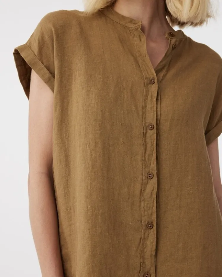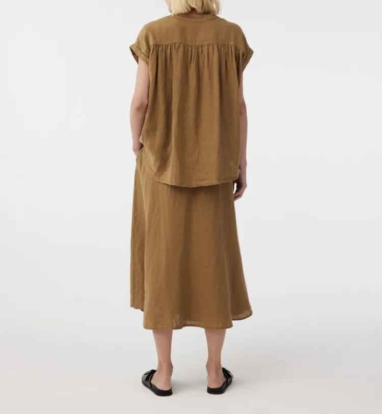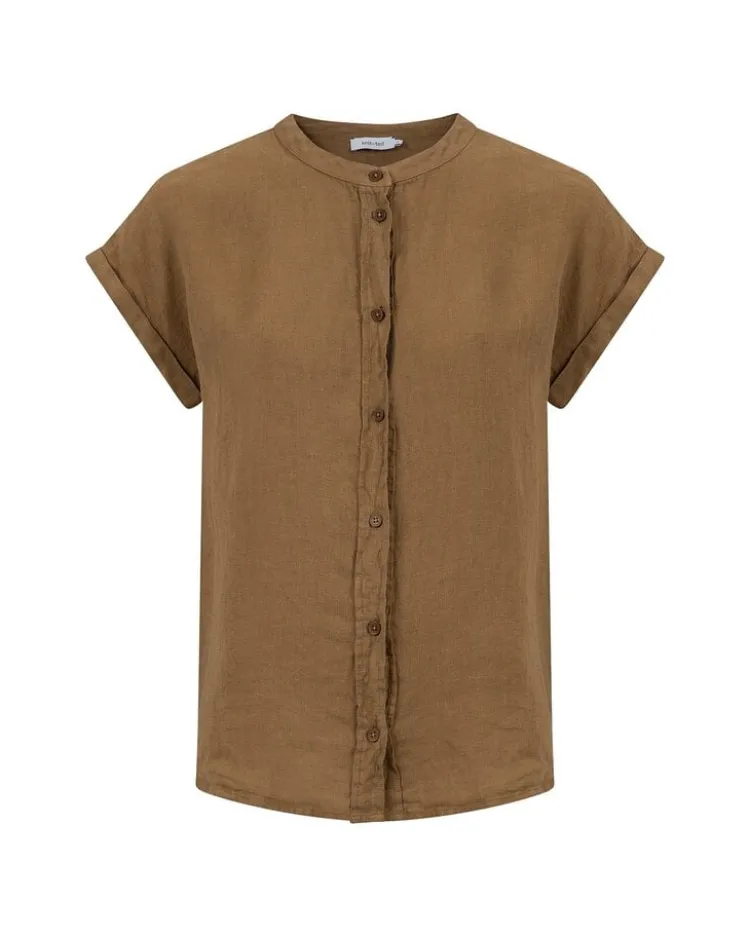 De Rumi-blouse heeft een ronde hals, korte mouwen en een knoopsluiting aan de voorkant, afgewerkt met subtiele plooien op de rug voor een verfijnde look.