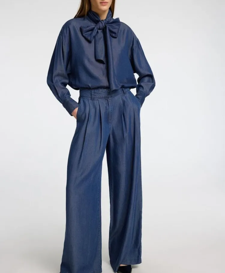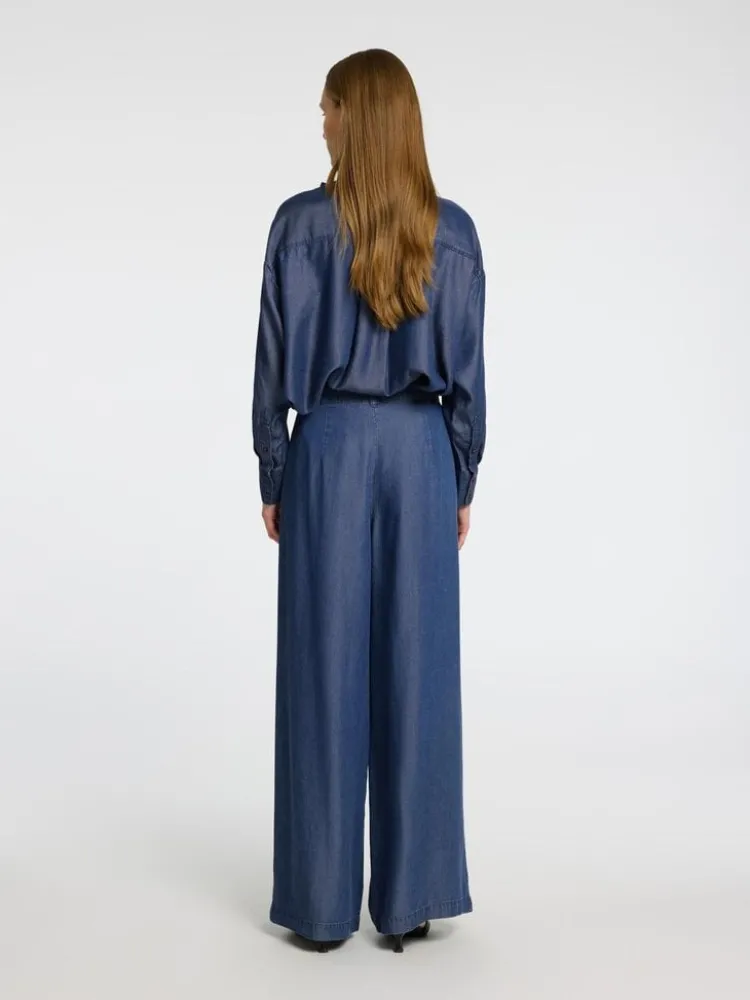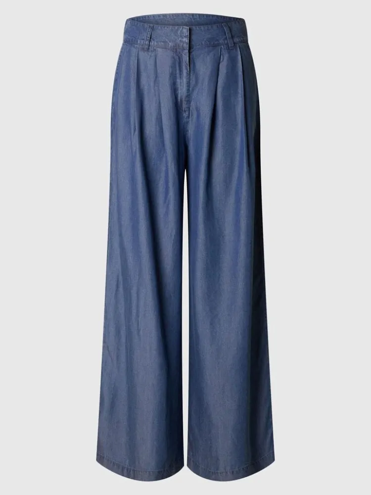 De Janna broek heeft een hoge taille, wijde pijpen, en is voorzien van een rits met haak- en oogsluiting. Details zoals riemlussen, steekzakken aan de zijkanten, en geplooide accenten aan de voorkant geven een stijlvolle touch aan dit item.