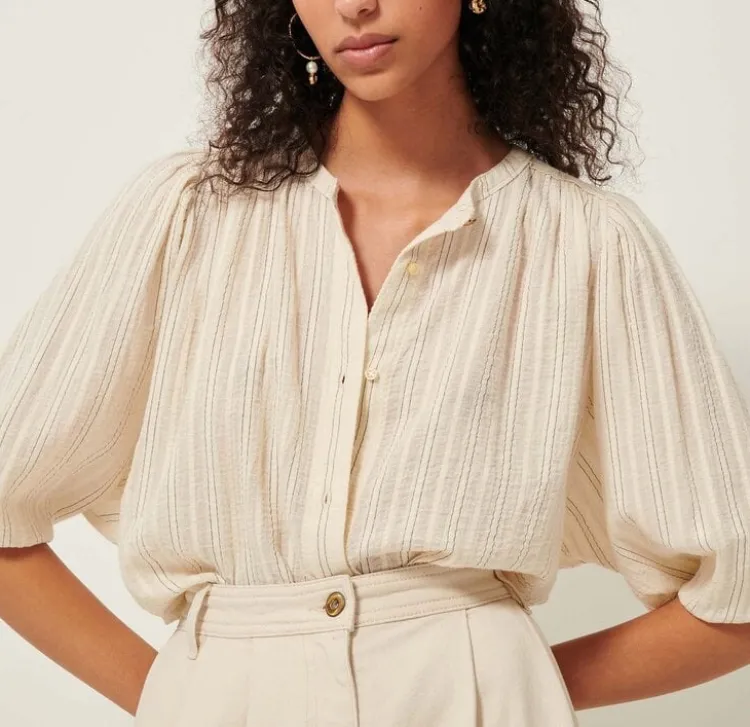 De A View blouse heeft ¾-lange ballonmouwen. Het ontwerp bevat een knoopsluiting met een sierknoop bij de kraag en plooien bij de schouders en manchetten.