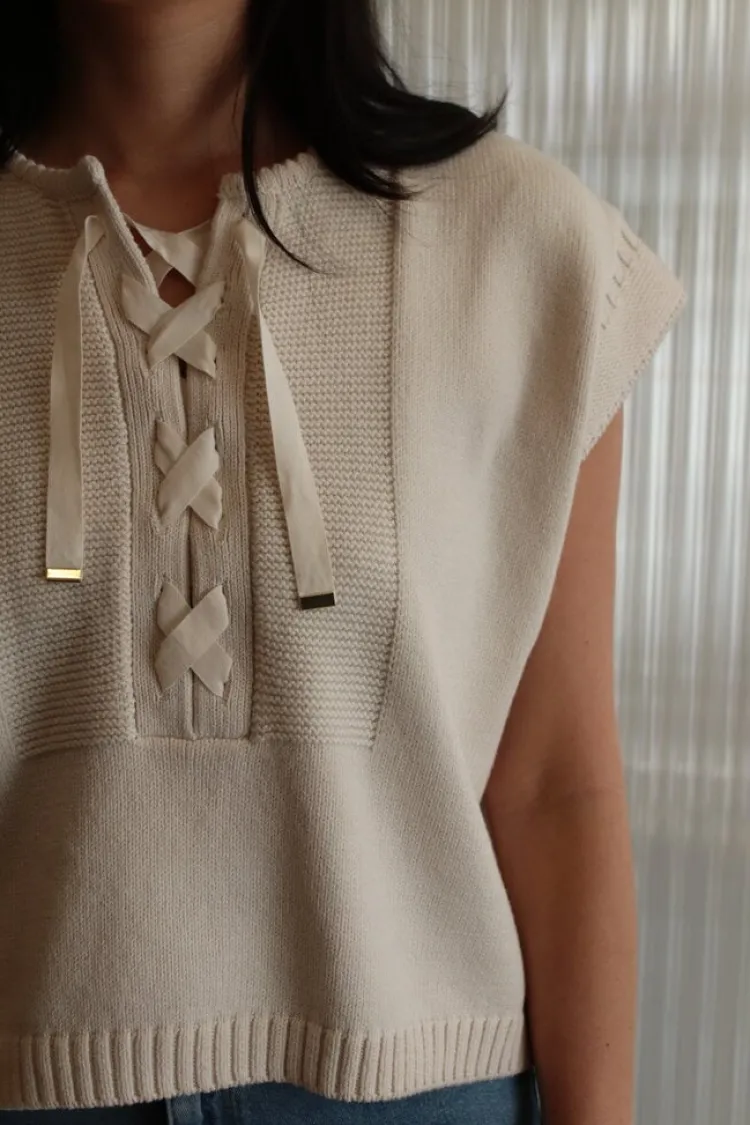 De Odyssee is een gebreide top, heeft een losse pasvorm met korte, uitlopende mouwen en een opvallende lintsluiting aan de voorkant. Het is afgewerkt met ribgebreide details aan de onderkant en de mouwen, wat een subtiele textuur toevoegt.