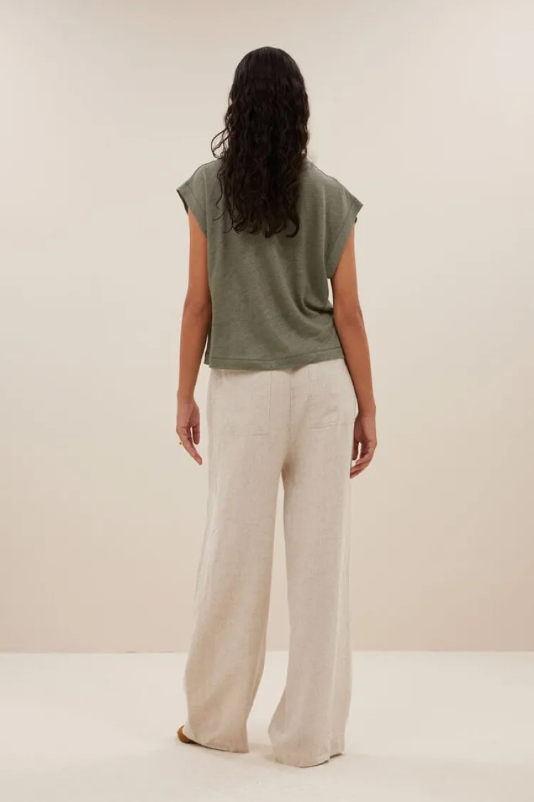 De Mason Linen Top, een mouwloze top met ronde hals, gemaakt van 100% linnen. Ideaal voor een ontspannen look en comfortabel genoeg voor elke gelegenheid.