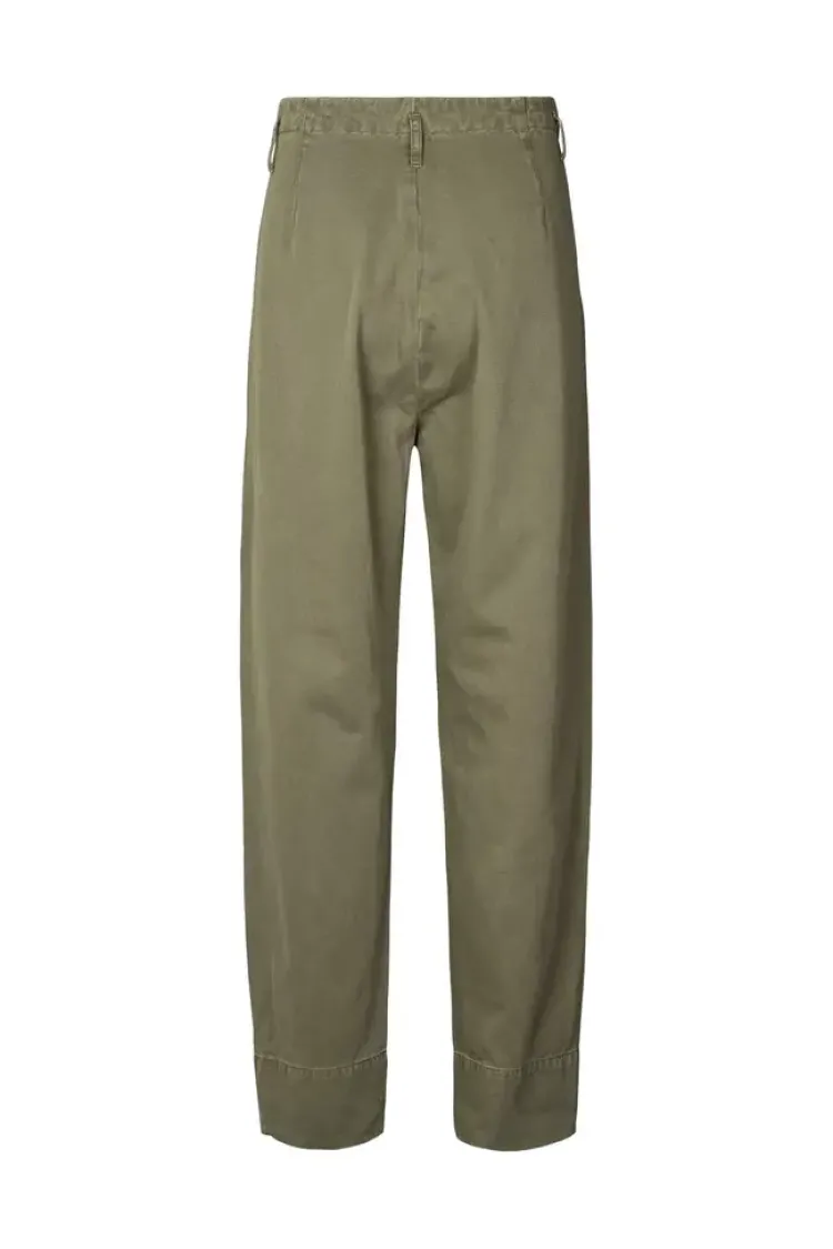 De Riana broek in olijfgroen canvas heeft een nauwsluitende taille, riemlussen, een ritssluiting voor en taps toelopend…