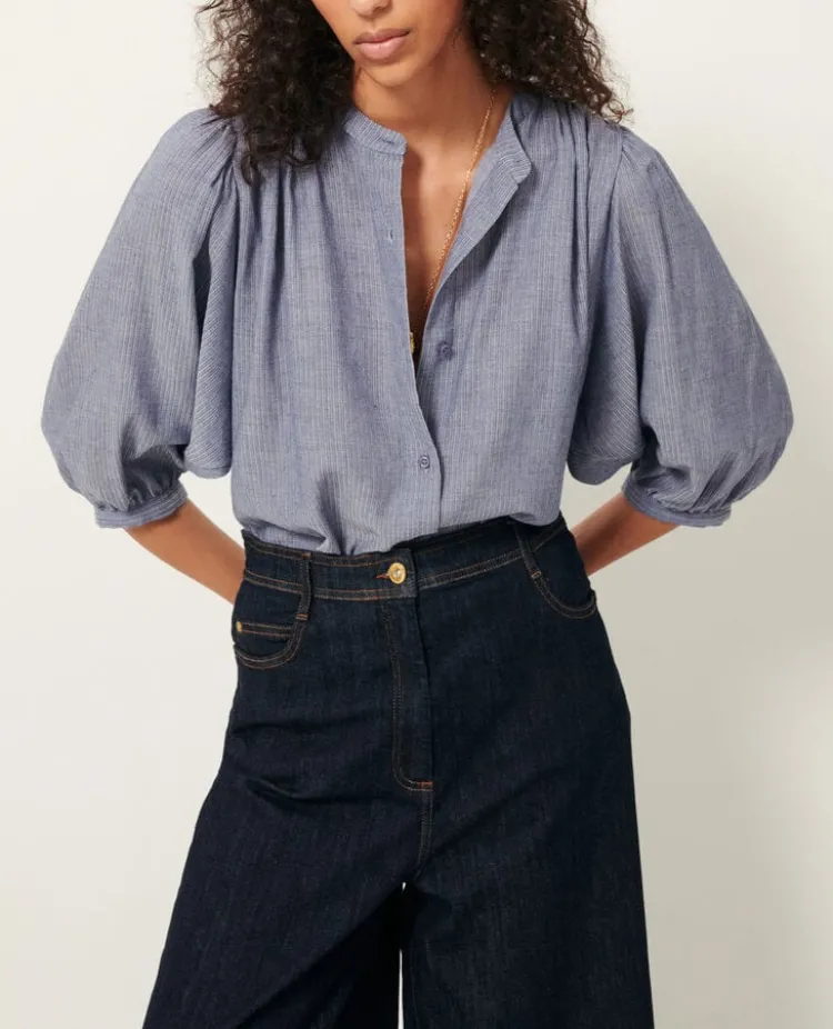 De A View blouse heeft ¾-lange ballonmouwen. Het ontwerp bevat een knoopsluiting met een sierknoop bij de kraag en plooien bij de schouders en manchetten.